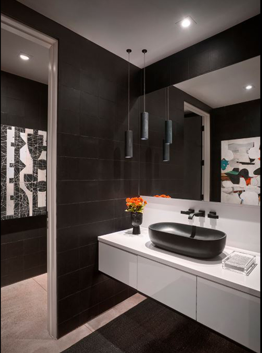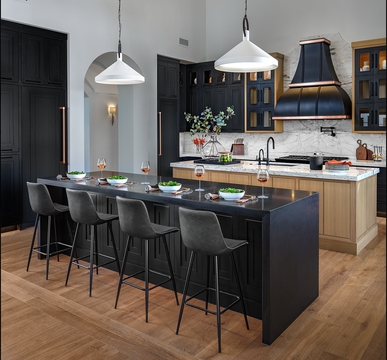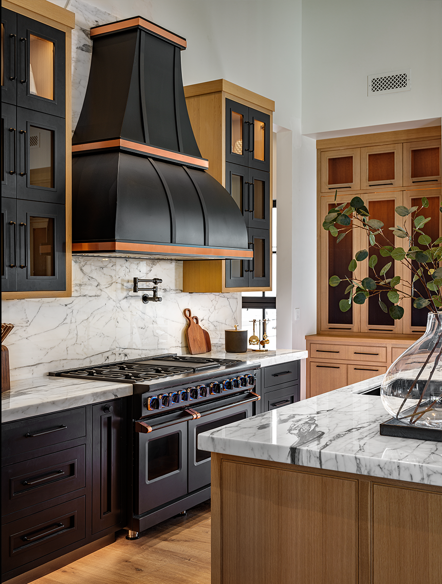 Design showhouses are meant to be an opportunity for personal immersion in exciting, cutting-edge design, to be experienced by people who enjoy seeing fresh designs in person. However, this showhouse was scheduled to open just when Covid shut most everything down, and became a “Virtual” online showhouse. Although it wasn’t the exposure we had prepared for, we enjoyed the opportunity to create a stunning powder room, and a kitchen/morning room, both emphasizing Black as an accent color. The appliances with Rose Gold metal accents allowed us to stretch our design sensibilities and include this very special metal on the custom kitchen rangehood.